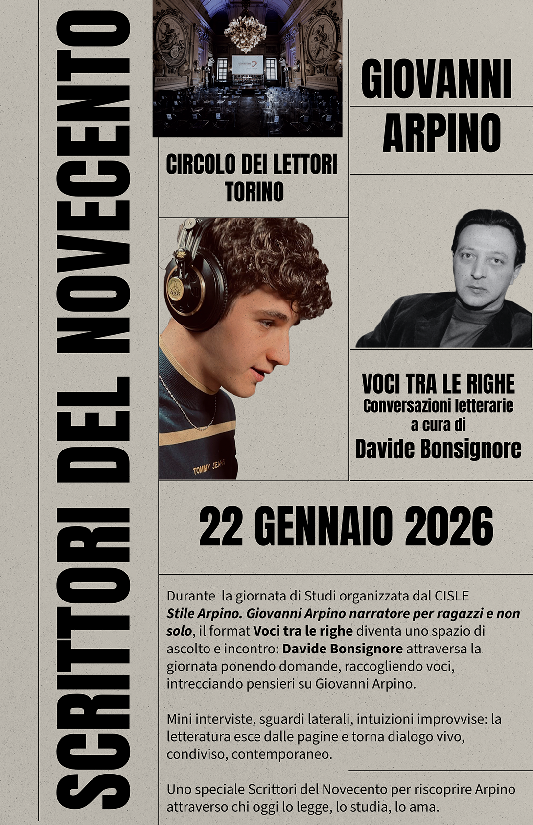 Durante la giornata di Studi organizzata dal CISLE Stile Arpino. Giovanni Arpino narratore per ragazzi e non solo, il format Voci tra le righe diventa uno spazio di ascolto e incontro: Davide Bonsignore attraversa la giornata ponendo domande, raccogliendo voci, intrecciando pensieri su Giovanni Arpino.